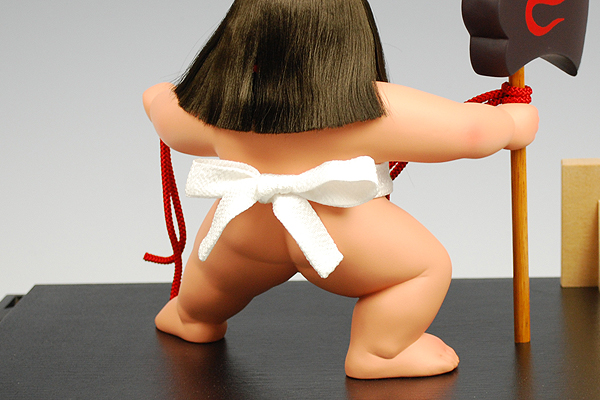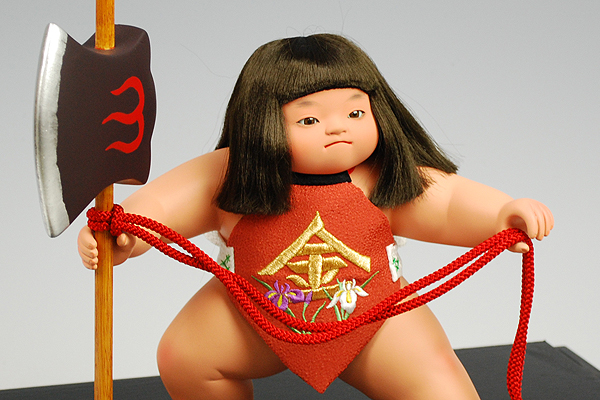 鉞を担いで熊の背に乗り、菱形の赤い腹掛けをつけた元気な少年像として、五月人形のお節句として飾られるようになりました。
