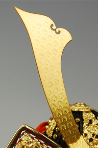 | 鍬形の受け台には力強く、健やかな成長の願いを込めて『菊水』の彫金細工を施しました。 |
