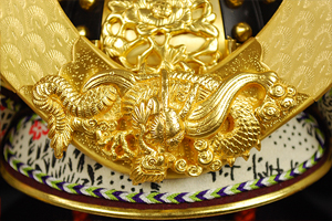 | 優雅な曲線を描き、渦巻く雲から今にも飛び出してきそうな豪快な龍。鱗の一枚一枚まで表現された精密な龍飾りは、珠玉の逸品です。 |