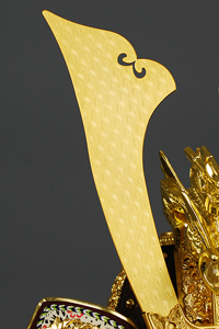 | 平安武久氏の前立には姫小松(ひめこまつ)を素材とする木彫りの龍が輝きます。反り返った鱗の一枚一枚、手足にからみつく雲、いまにも炎を吹き上げんばかりの舌…、彫刻師の巧みな技が感じられます。この龍に瑪瑙(めのう)の玉を抱かせ、銅の髭が付けられると、箔押師の手に移り、ここで金箔を施され金色に輝く龍となって、燦然と平安武久謹製の兜に君臨します。 |