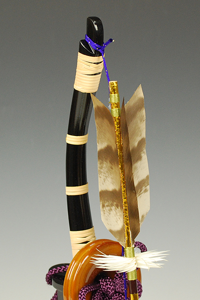 | 印刷によって加工された羽根が多いなか、人形のフタバでは希少な金鶏鳥・銀鶏鳥・鷹などの天然の羽根を用いております。天然色ならではの自然な美しさが感じられます。また、 ビニール製のような簡単な創りではなく、本質にこだわり本物の籐巻の弓で仕上げました。気品の高さを演出します。 |