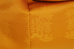 天皇陛下は、「天皇即位の礼」など重要な宮中諸祭儀においてこの御束帯を多くお召しになります。この束帯には、王者を象徴する吉祥文の「鳳凰」と「桐」、「竹」が選ばれています。ご存知の通り、「鳳凰」は想像上の鳥で、桐の林に棲み、竹の実を食べ、五色の羽をもち五音の声で鳴くといわれ、世に聖帝が出て正しい政治がおこなわれると姿を現すといわれていました。天皇の御束帯に独特の格調高い文様として、伝統ある儀式とともに今日まで継承されています。
